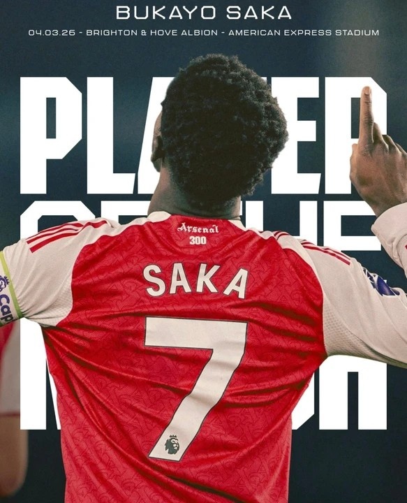 打进制胜球!阿森纳官方:萨卡当选击败布莱顿队内最佳球员